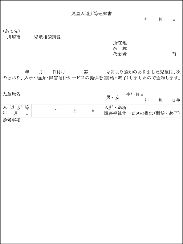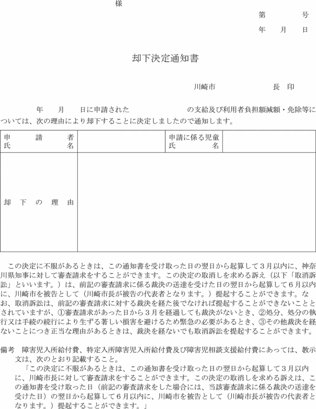 第9条の3 児童相談所長は、法第24条の3第2項の規定により障害児入所給付費の支給の要否の決定を行った場合において、支給の決定をしたときは障害児入所給付費等支給決定通知書兼利用者負担額減額・免除等決定通知書(第20号の4様式)により、支給しないことを決定したときは却下決定通知書により、当該支給の申請をした者に通知するものとする。