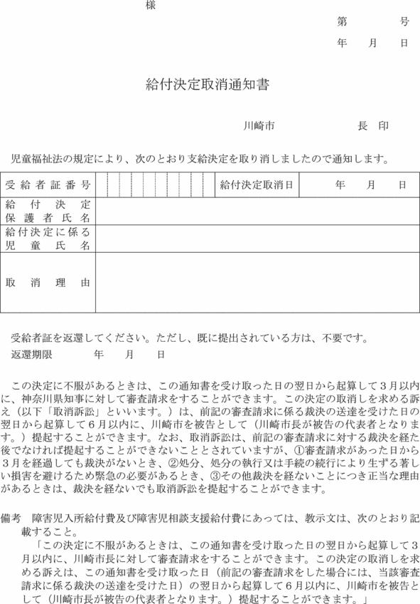 第7条の6 福祉事務所長は、法第21条の5の9第1項の規定により通所給付決定の取消しを行ったときは、給付決定取消通知書(第15号の7様式)により当該通所給付決定の取消しに係る通所給付決定保護者(法第6条の2の2第8項に規定する通所給付決定保護者をいう。)に通知するものとする。