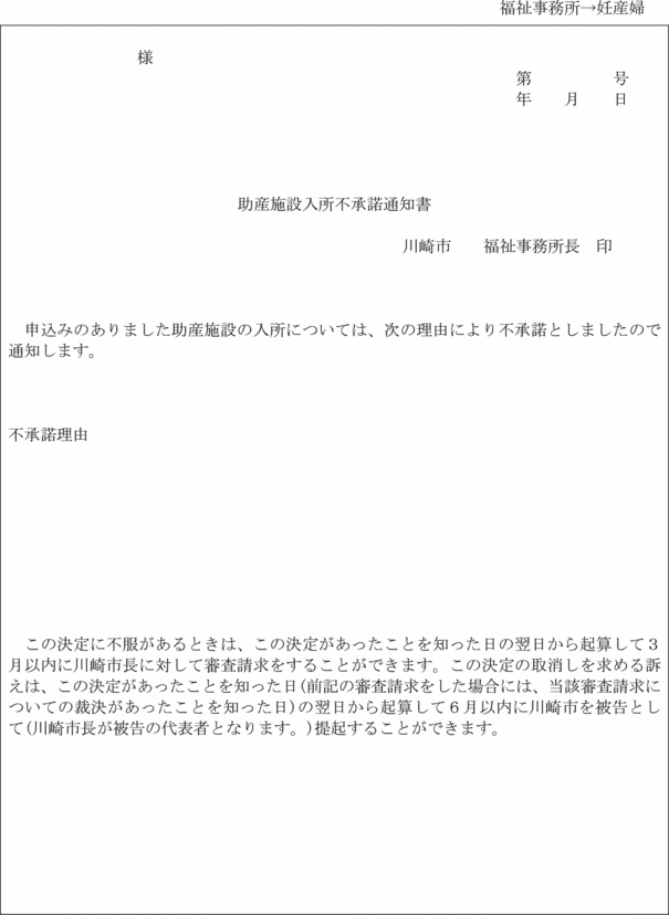 第9条 福祉事務所長は、法第22条第1項の規定による助産の実施を承諾するときは助産施設入所(変更)決定通知書(第19号様式)により助産施設の長及び妊産婦に通知し、承諾しないときは助産施設入所不承諾通知書(第19号の2様式)により妊産婦に通知しなければならない。