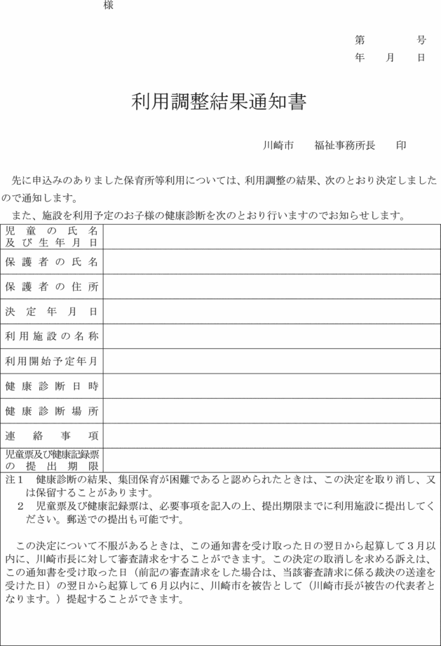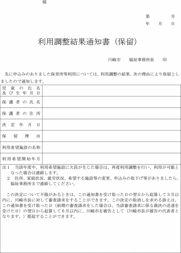 5 福祉事務所長は、法第24条第3項(法第73条第1項の規定により読み替えて適用する場合を含む。)に規定する調整を行った場合においては、法第24条第3項の利用を認めたときは利用調整結果通知書(第20号様式)により、同項の利用を認めなかったときは利用調整結果通知書(保留)(第20号の2様式)により、当該調整に係る保護者に対し通知するものとする。