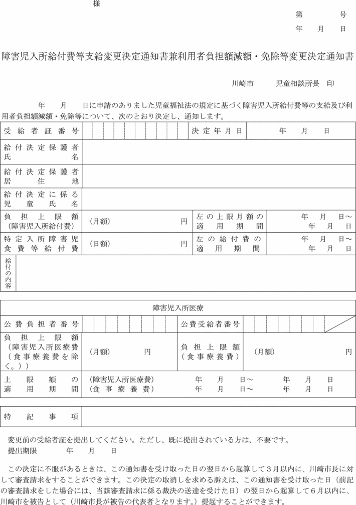 2 児童相談所長は、前項の規定による申請があった場合において、入所給付決定の変更をしたときは障害児入所給付費等支給変更決定通知書兼利用者負担額減額・免除等変更決定通知書(第20号の8様式)により、入所給付決定の変更をしないことを決定したときは却下決定通知書により、当該変更の申請をした者に通知するものとする。