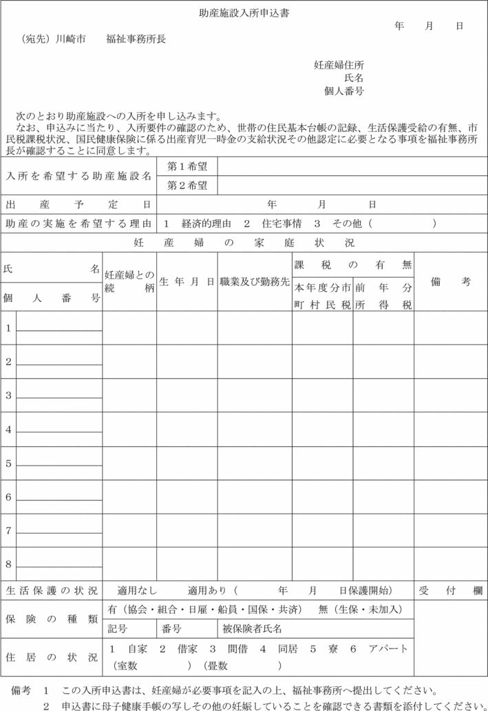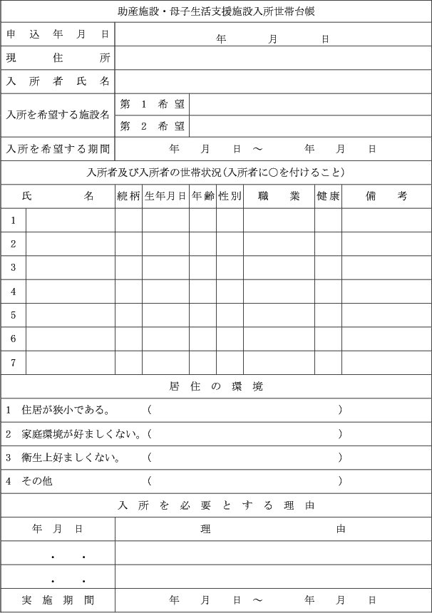 第8条 法第22条第2項に規定する助産施設への入所申込みは、助産施設入所申込書(第16号様式)に母子健康手帳の写しその他の妊娠していることを確認できる書類を添えて行わなければならない。