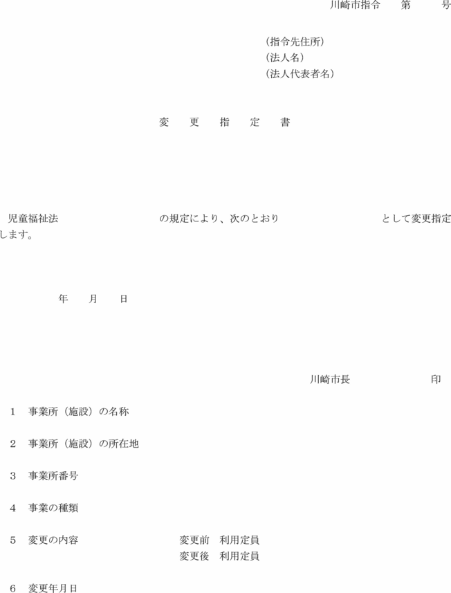第7条の10 法第21条の5の20第1項の規定による指定の変更の申請は、指定変更申請書(第15号の15様式)に市長が別に定める書類を添えて行うものとする。