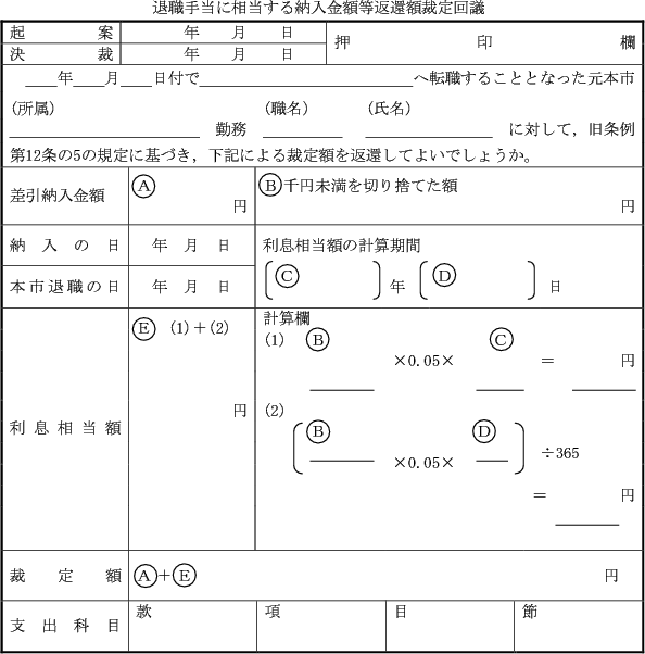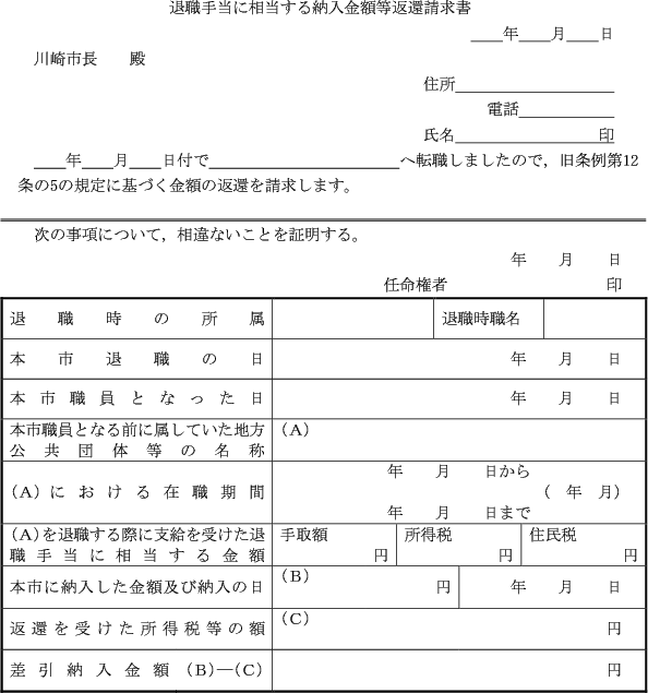 第4条 旧条例第12条の5の規定に基づき、前2条の規定により計算した金額の合計額の返還を受けることのできる者は、退職手当に相当する納入金額等返還請求書(様式1号)を、退職後速やかに、市長に提出しなければならない。