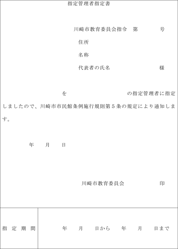 第5条 委員会は、条例第4条の2第1項の指定をしたときは、指定された法人等に対し、指定管理者指定書(別記様式)により通知する。