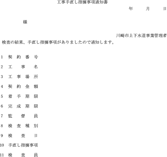 第10条 検査担当課長は、検査の結果、手直し、指摘事項その他意見があった場合は、直ちに工事手直し指摘事項通知書により工事担当課長及び請負人に通知しなければならない。
