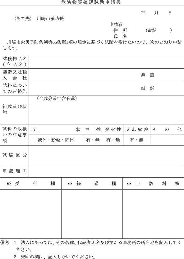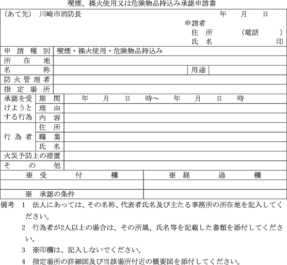 第7条 条例第26条第1項の指定場所において、業務上喫煙し、裸火を使用し又は当該場所に危険物品(常時携帯するもので軽易なものを除く。)を持ち込む場合の同条同項ただし書の規定の適用を受けようとする者は、喫煙、裸火使用又は危険物品持込み承認申請書(第2号様式)により申請しなければならない。