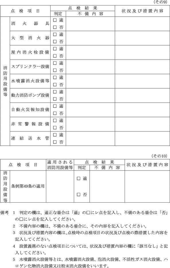 第4条 条例第14条第1項第9号条例第11条の2第1項及び第3項第14条第3項第14条の2第3項第15条第2項及び第3項第16条第2項及び第4項第17条第2項第18条第2項並びに第19条第2項の規定において準用する場合を含む。)に規定する電気設備等の点検及び絶縁抵抗等の測定試験の結果並びに補修の記録は、電気設備等点検補修記録表(第1号様式)により行うものとする。