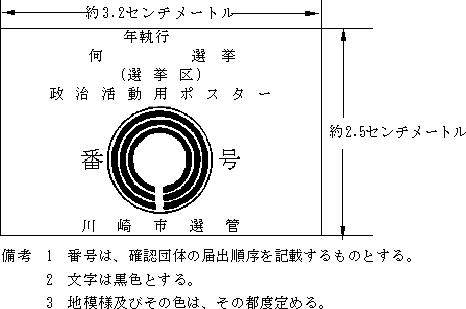 3 証紙交付票の交付を受けた政党その他の政治団体が、第1項の証紙の交付を受けようとするときは、当該証紙交付票に政党その他の政治団体名及び代表者氏名を記入し、これに第1項の証紙をはるべき法第201条の8第1項第4号又は法第201条の9第1項第4号の規定によるポスター(以下「政治活動用ポスター」という。)の見本3枚(記載内容が異なる政治活動用ポスターがある場合には、それぞれ3枚)を添えて市委員会に提出しなければならない。