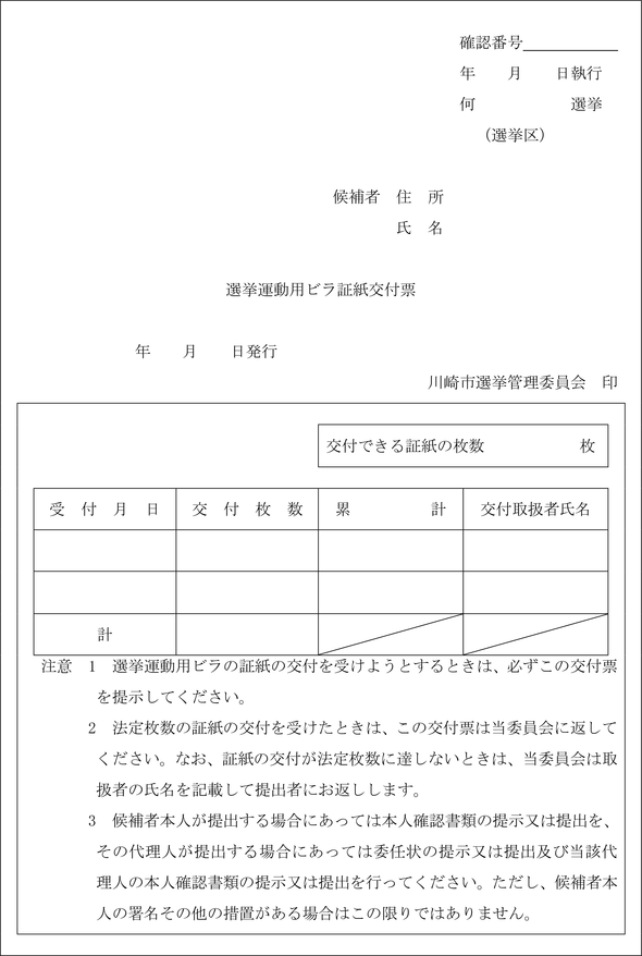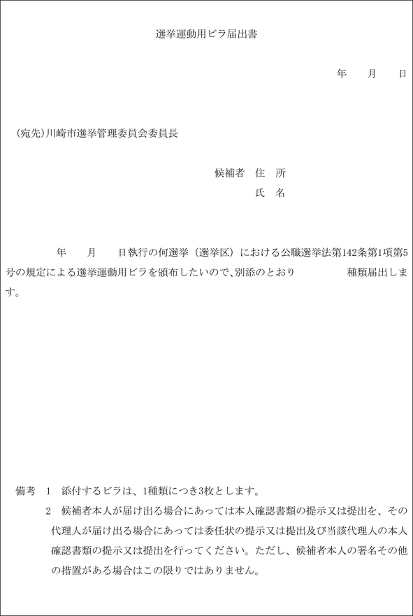 2 前項の届出をする場合には、当該届出に係る選挙運動用ビラ3枚(2種類の選挙運動用ビラがある場合には、それぞれ3枚)を添えなければならない。