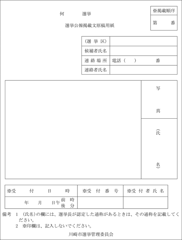 第3条 この規程において「法」とは公職選挙法(昭和25年法律第100号)を、「令」とは公職選挙法施行令(昭和25年政令第89号)を、「市委員会」とは川崎市選挙管理委員会を、「区委員会」とは川崎市の区選挙管理委員会をいう。
