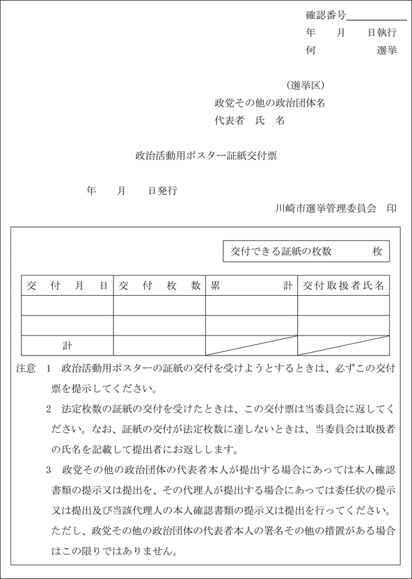 2 前項の証紙の交付を受けようとする政党その他の政治団体に対し、政治活動用ポスター証紙交付票(第49号様式。以下この条において「証紙交付票」という。)を第73条の規定による確認書を交付する際に併せて交付する。