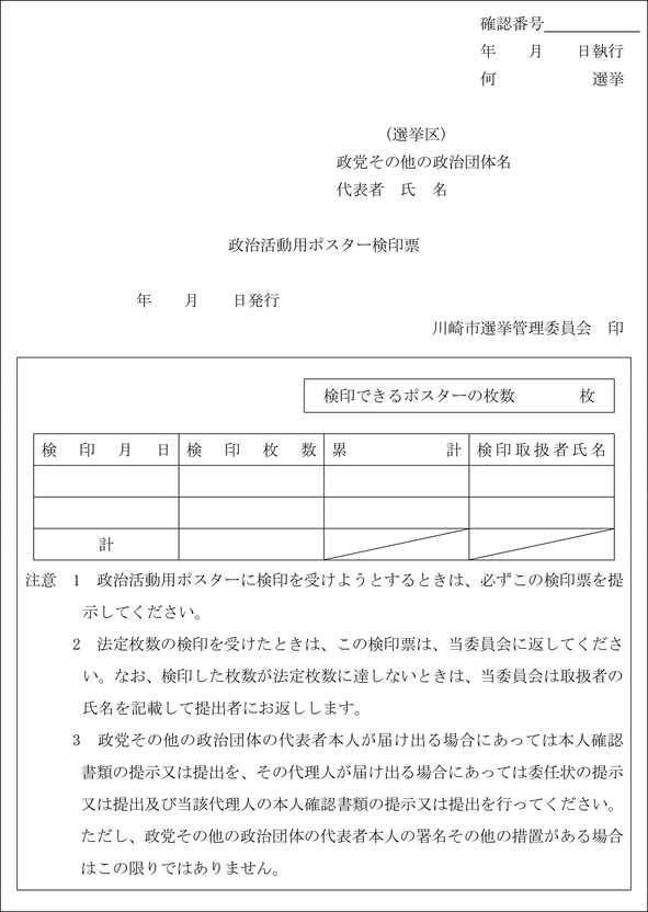 3 検印票の交付を受けた政党その他の政治団体が第1項の検印を受けようとするときは、当該検印票に政党その他の政治団体名及び代表者氏名を記入し、これに検印を受けるべき政治活動用ポスター及びその見本3枚(記載内容が異なる政治活動用ポスターがある場合には、それぞれ3枚)を添えて市委員会に提出しなければならない。