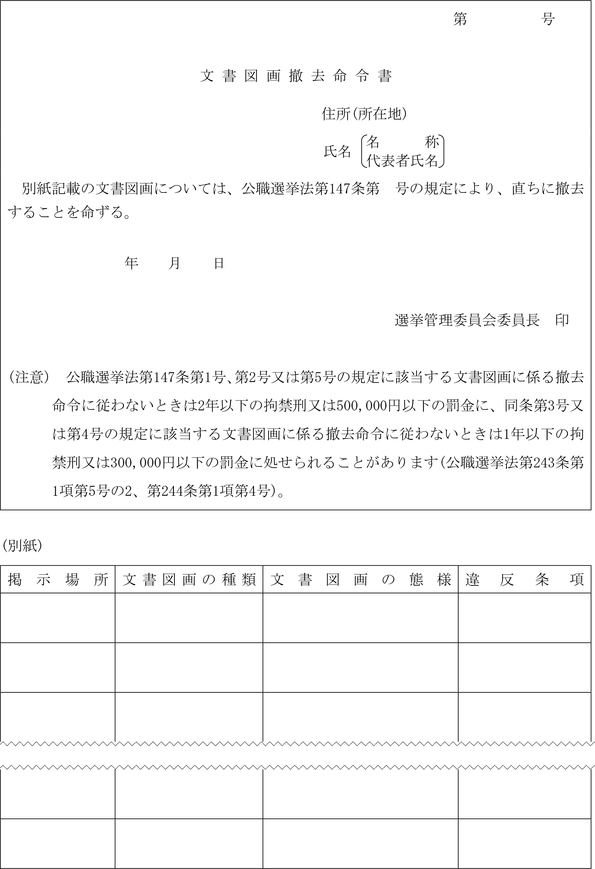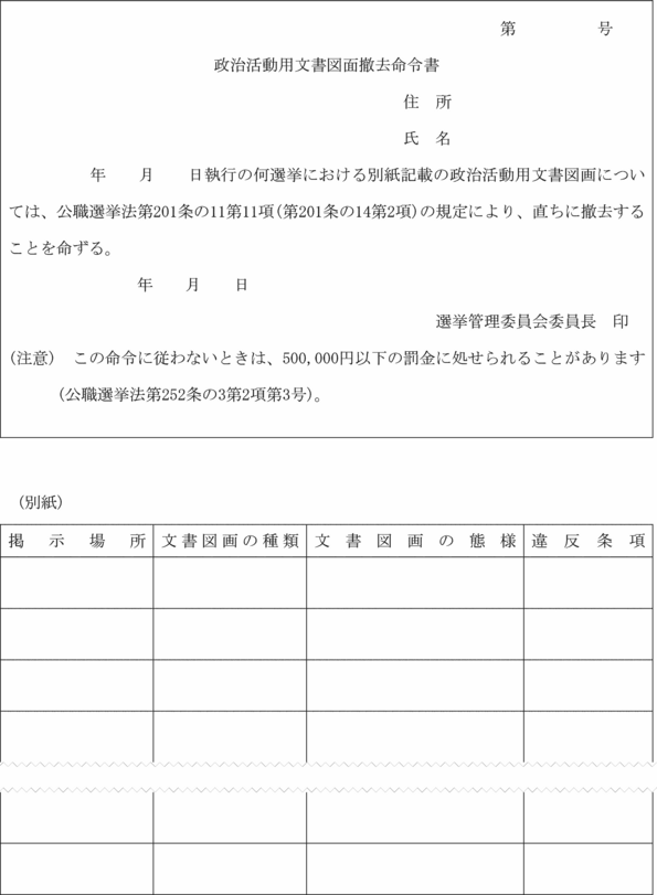 第81条 法第201条の11第11項又は法第201条の14第2項の規定により、市委員会が文書図画の撤去を命ずるときは、政治活動用文書図画撤去命令書(第53号様式)による。