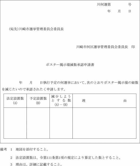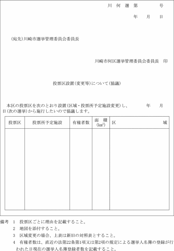 第4条 区委員会は、法第17条第2項の規定による投票区を設け、若しくはその区域を変更し、又は投票所予定施設を設け、若しくはその施設を変更しようとするときは、あらかじめ投票区設置・変更協議書(第1号様式)により市委員会に協議しなければならない。