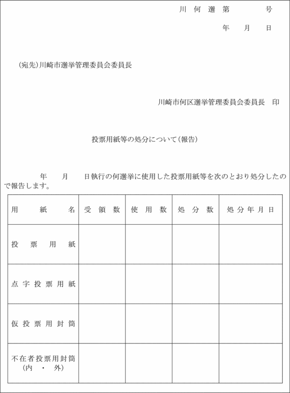 第7条 選挙及び当選の効力が確定したときは、区委員会は、投票管理者から送付を受けた汚損及び残余の投票用紙、封筒及び投票に用いた物品(以下この条において「投票用紙等」という。)のうち、投票用紙は直ちに処分(焼却又はこれに準ずる処分)するとともに、遅滞なく投票用紙等処分報告書(第3号様式)により、市委員会にその旨を報告しなければならない。法第100条第4項の規定により、投票を行わない場合の投票用紙等についてもまた同様とする。