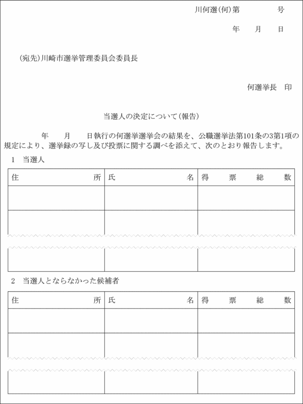 第13条 法第101条の3第1項の規定により選挙長が市委員会にする報告は、当選人決定等報告書(第5号様式)によらなければならない。