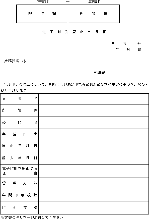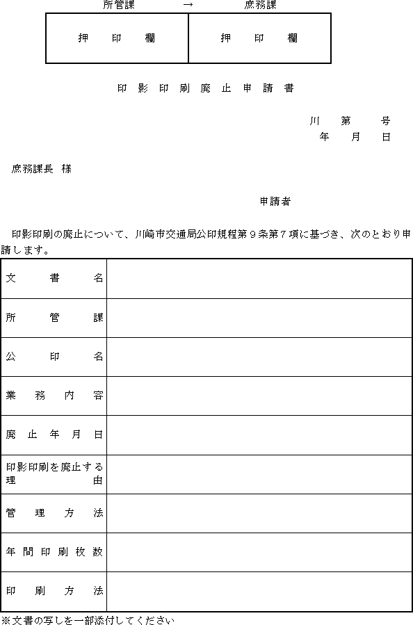 7 所管課長は、印影印刷を行う必要がなくなったときは、印影印刷廃止申請書(第5号様式)により速やかに庶務課長に届け出なければならない。