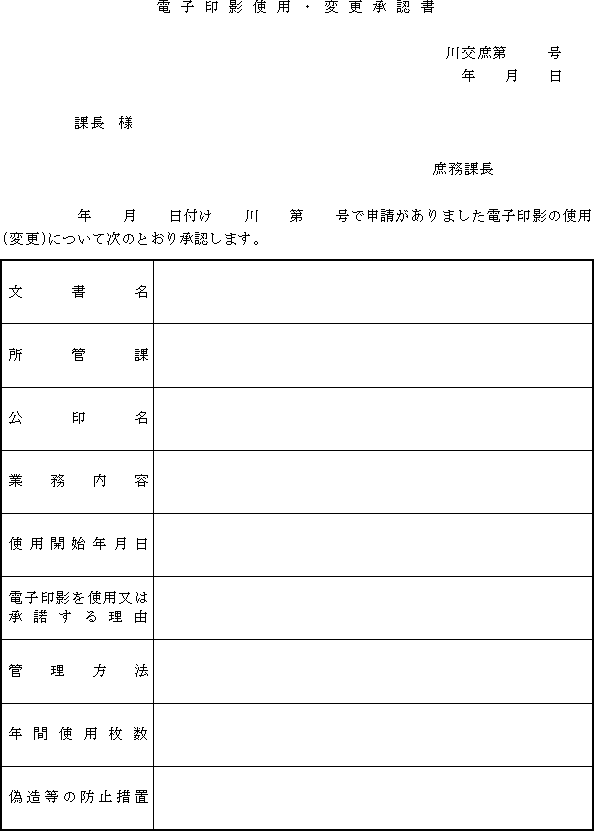 3 庶務課長は、前2項の規定に基づき、当該文書に電子印影を用いることを審査し、電子印影の使用の開始又は使用方法の変更を承認するときは電子印影使用・変更承認書(第7号様式)を所管課長に交付する。