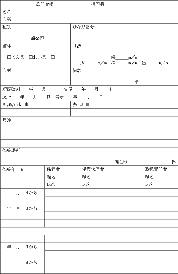 ひな方番号 | 公印 | 書体 | 寸法(ミリメートル) | 用途 | 保管者 | 保管場所 |