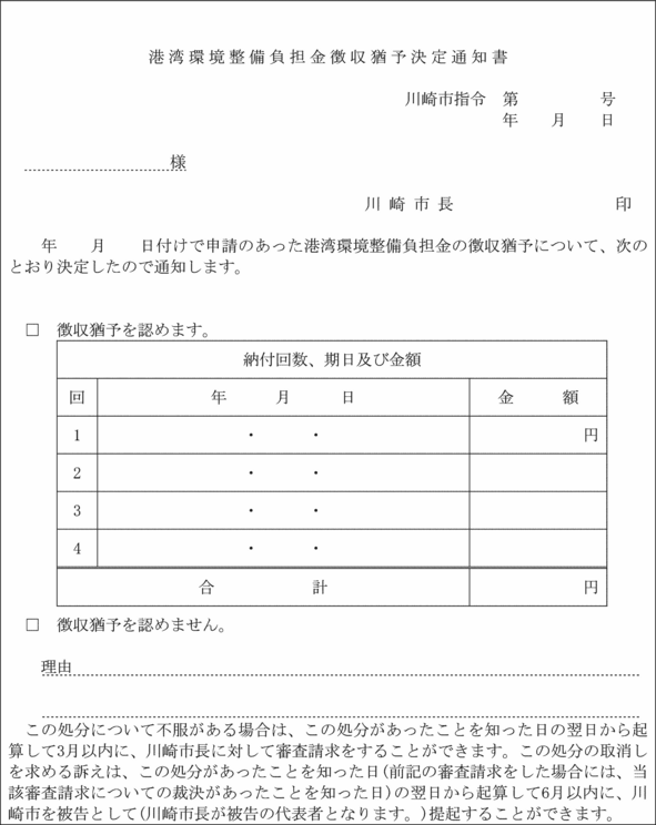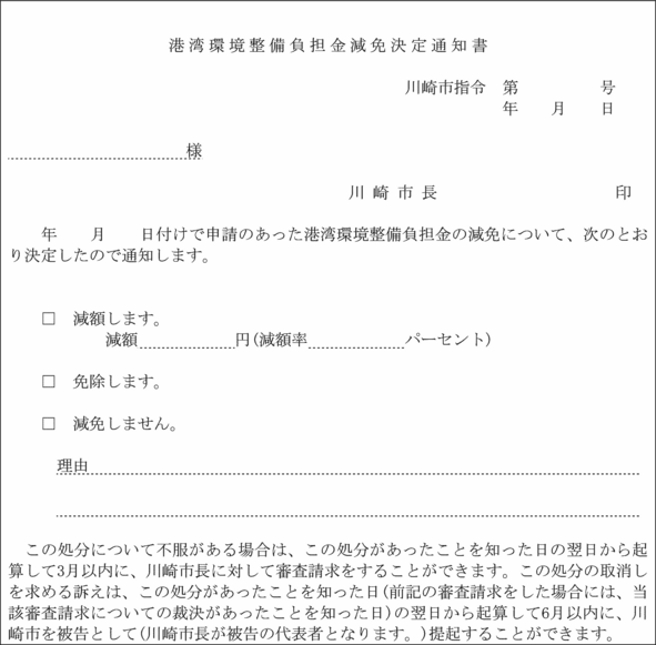 3 市長は、負担金の減額又は免除の可否を決定したときは、港湾環境整備負担金減免決定通知書(第10号様式)により通知するものとする。