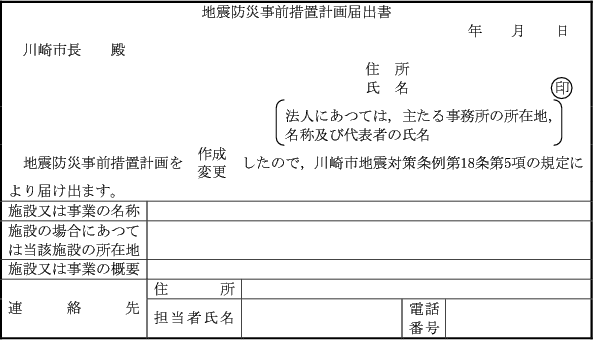 第5条 条例第18条第5項の規定による届出は、地震防災事前措置計画(条例第19条の規定により地震防災事前措置計画とみなされるものを含む。)及びその写しそれぞれ1部を地震防災事前措置計画届出書(第1号様式)とともに提出して行うものとする。