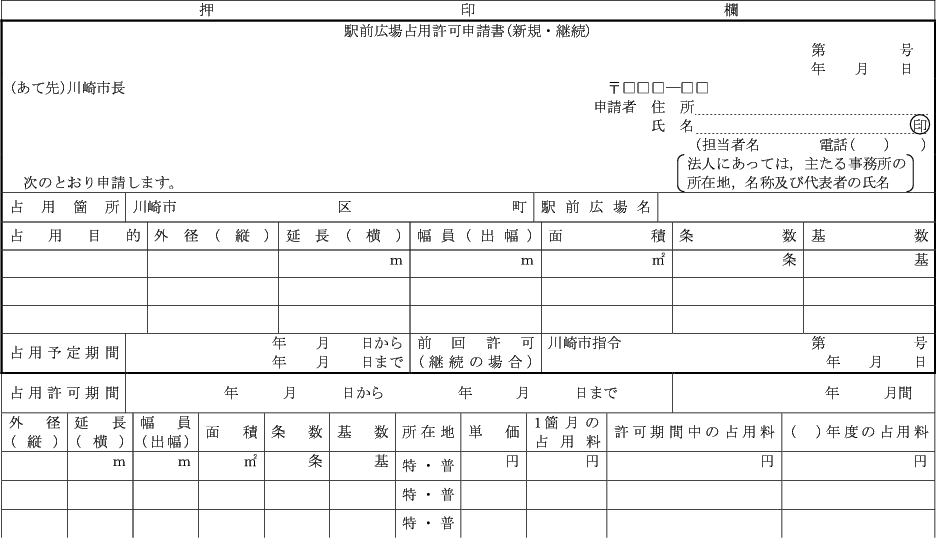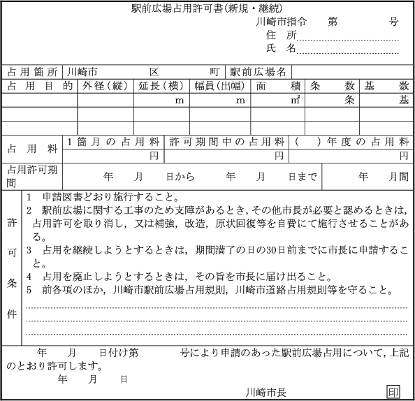 第3条第1項及び第6条に規定する許可申請 | 駅前広場占用許可書(新規・継続)(第4号様式) |