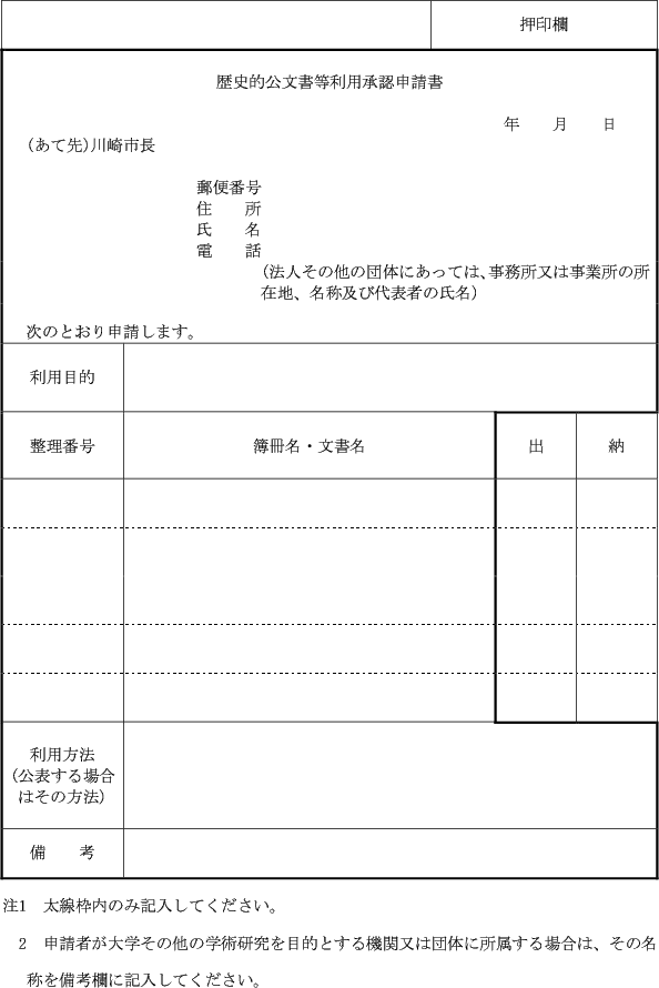 2 条例第6条第1項の規定により歴史的文化的価値のある公文書及び資料類(以下「歴史的公文書等」という。)の利用承認を受けようとする者(以下「歴史的公文書等申請者」という。)は、歴史的公文書等利用承認申請書(第1号様式)を市長に提出しなければならない。