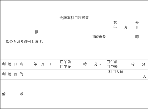 第9条 市長は、会議室の利用を許可したときは、会議室利用許可書(第5号様式)を会議室申請者に交付するものとする。