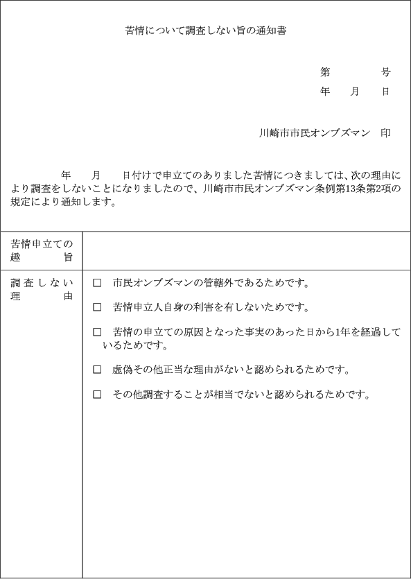 (苦情について調査しない旨の通知)