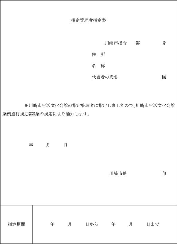 第5条 市長は、条例第4条第1項の指定をしたときは、指定された法人等に対し、指定管理者指定書(別記様式)により通知する。