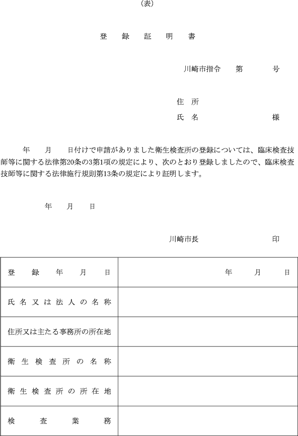 第3条 市長は、法第20条の3第1項の規定により衛生検査所の登録を受けた者に、省令第13条の規定により、登録証明書(第1号様式)を交付する。