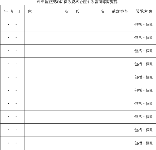 第6条 資格を証する書面等を閲覧しようとする者(以下「閲覧者」という。)は、外部監査契約に係る資格を証する書面等閲覧簿(別記様式)に必要な事項を記入しなければならない。