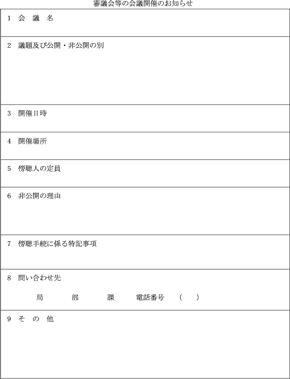 第2条 条例第6条に規定する審議会等の会議開催の事前公表は、当該会議を開催する日の1週間前までに、審議会等の会議開催のお知らせ(別記様式)を区役所、区役所支所、川崎市公文書館及び情報プラザに備え置くとともに、当該お知らせに掲げる事項をインターネットの本市のホームページに登載することにより行うものとする。