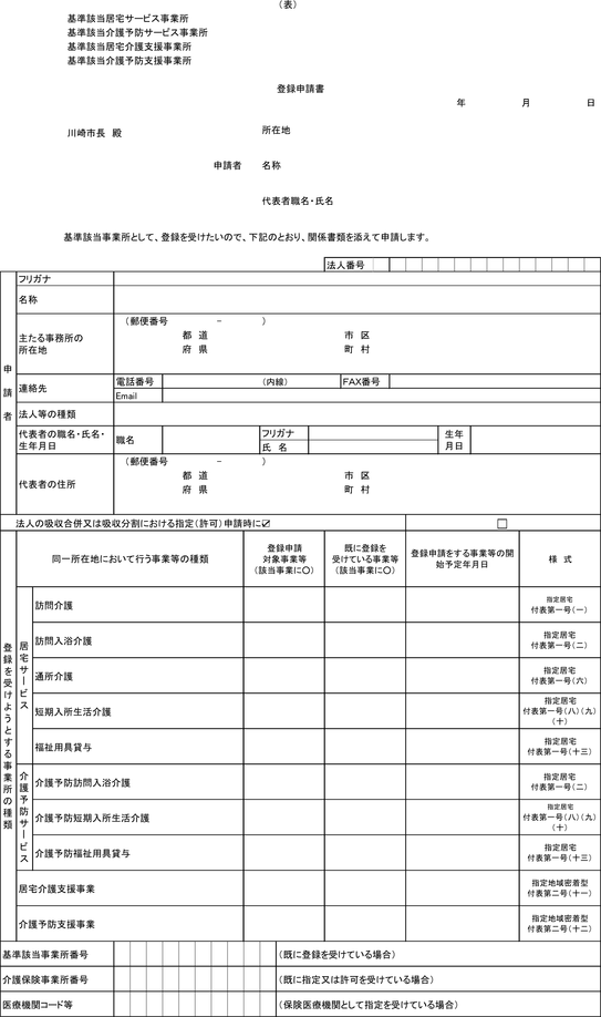 第4条 前条第1項の登録を受けようとするものは、基準該当居宅サービス又は基準該当介護予防サービス(以下「基準該当居宅サービス等」という。)の事業の種類及び基準該当居宅サービス等の事業を行う事業所ごとに、登録申請書(第1号様式)に次に掲げる事項を記載した書面を添えて、市長に申請しなければならない。
