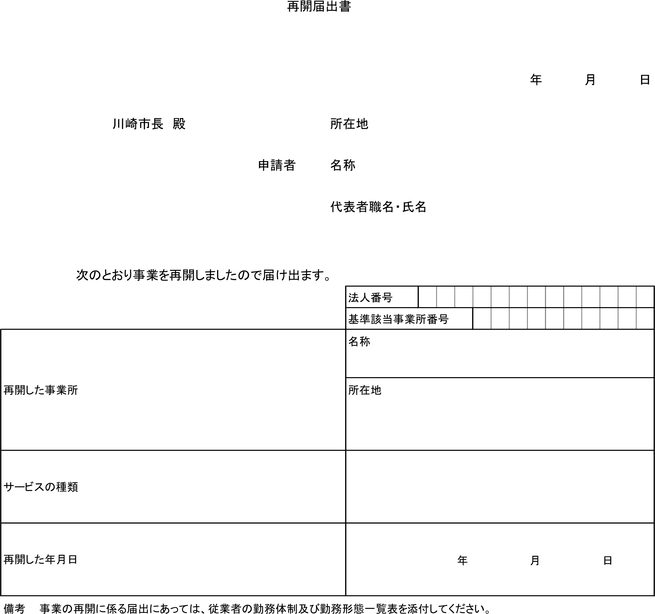 2 登録事業者は、基準該当居宅サービス等又は基準該当居宅介護支援の事業を再開したときは、10日以内に、その旨を、当該事業に従事する従業者の勤務体制及び勤務形態に関する書類を添えて、再開届出書(第5号様式)により市長に届け出なければならない。