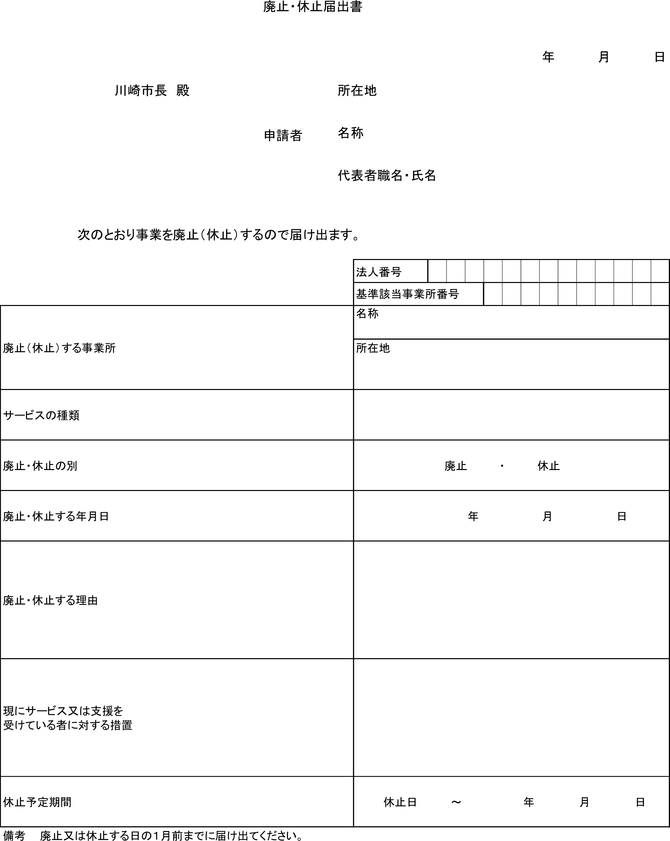 3 登録事業者は、基準該当居宅サービス等又は基準該当居宅介護支援の事業を廃止し、又は休止しようとするときは、その廃止又は休止の日の1月前までに、その旨を、廃止・休止届出書(第6号様式)により市長に届け出なければならない。