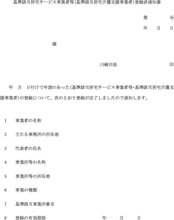 第7条 市長は、第3条第2項又は第5条第2項の規定により登録したときは、基準該当居宅サービス事業者等(基準該当居宅介護支援事業者)登録済通知書(第2号様式)により当該登録を受けた事業者(以下「登録事業者」という。)に通知するものとする。