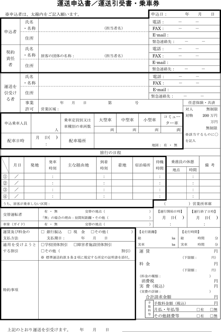 第9条 前条の規定による貸切自動車の運送の申込みを受け付け、運輸上支障がないと認めた場合は、貸切自動車の運送を引き受け、旅客に運送引受書(別記様式)を交付する。
