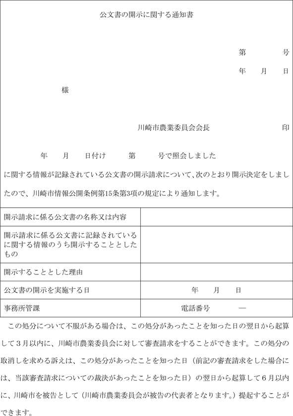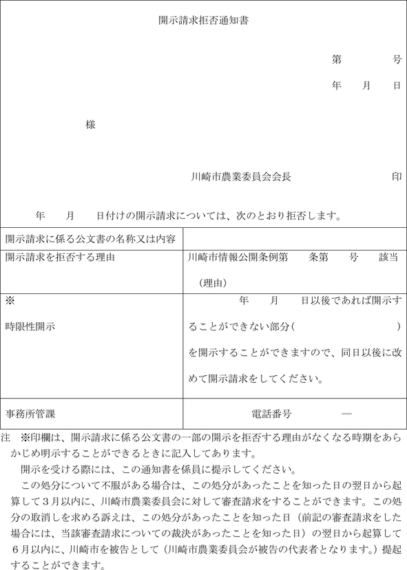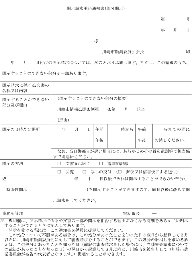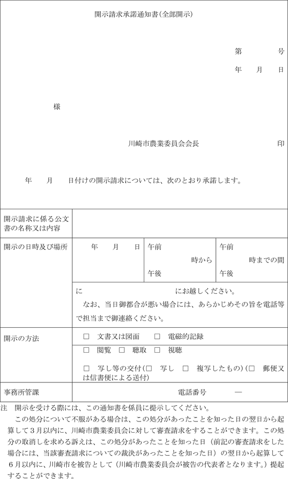 第5条 条例第12条第3項の規定による通知は、開示請求の全部を承諾することと決定したときは開示請求承諾通知書(全部開示)(第3号様式)により、一部を除き承諾することと決定したときは開示請求承諾通知書(部分開示)(第4号様式)により行うものとし、開示請求の全部を拒否することと決定したときは開示請求拒否通知書(第5号様式)により行うものとする。