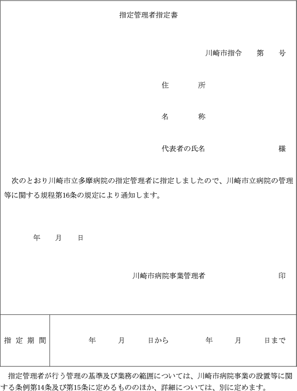第13条 管理者は、条例第13条第1項の規定により川崎市立多摩病院の管理を行わせるため、法人その他の団体(以下「法人等」という。)を指定しようとするときは、あらかじめ次に掲げる事項を公告する。
