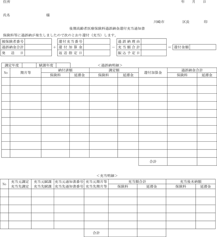 第3条 区長は、納付された保険料又は延滞金(以下「納付金」という。)に過納又は誤納があった場合において、当該過納又は誤納に係る納付金(以下「過誤納金」という。)を還付し、又は充当するときは、過誤納金還付充当通知書により被保険者又は連帯納付義務者(以下「納付義務者」という。)に通知するものとする。