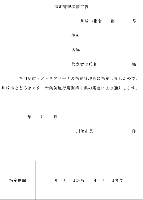 第5条 市長は、条例第4条第1項の指定をしたときは、指定された法人等に対し、指定管理者指定書(別記様式)により通知する。