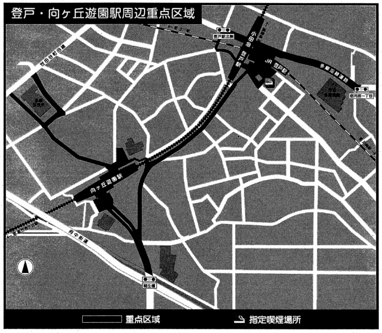 登戸・向ヶ丘遊園駅周辺 | 登戸駅第1指定喫煙場所 多摩区登戸3465番の一部 | 別図第1のとおり | 市が設置した喫煙設備の周囲の地面に表示した緑色の線で囲まれた部分 |
