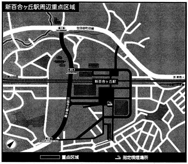 新百合ヶ丘駅周辺 | 新百合ヶ丘駅第1指定喫煙場所 麻生区上麻生1丁目21番の一部 | 別図第1のとおり | 市が設置した喫煙設備の周囲の地面に表示した緑色の線で囲まれた部分 |