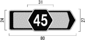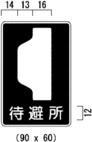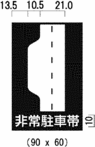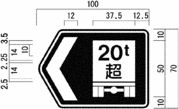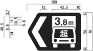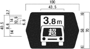 縁は、自動車専用道路以外の道路に設置するもので、「待避所」、「駐車場」及び「まわり道(120-Bに限る。)」を表示するものについては9ミリメートル、「都道府県道番号(118の2-Aに限る。)」、「総重量限度緩和指定道路」及び「高さ限度緩和指定道路」を表示するものについては16ミリメートル、「登坂車線」を表示するものについては10ミリメートル、「都道府県道番号(118の2-B及びCに限る。)」及び「道路の通称名」を表示するものについては8ミリメートル、その他のものについては日本字の大きさの20分の1以上の太さとし、縁線及び区分線は、日本字の大きさの20分の1以上の太さとする。