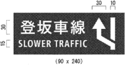 ク 自動車専用道路以外の道路に設置する「登坂車線」、「都道府県道番号(118の2-B及びCに限る。)」及び「道路の通称名」を表示する案内標識については、道路の形状又は交通の状況により特別の必要がある場合にあっては、図示の寸法の1.5倍又は2倍に、それぞれ拡大することができる。