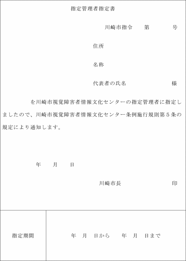 第2条 市長は、条例第4条第1項の規定により川崎市視覚障害者情報文化センター(以下「情報文化センター」という。)の管理を行わせるため、法人その他の団体(以下「法人等」という。)を指定しようとするときは、あらかじめ次に掲げる事項を公告する。