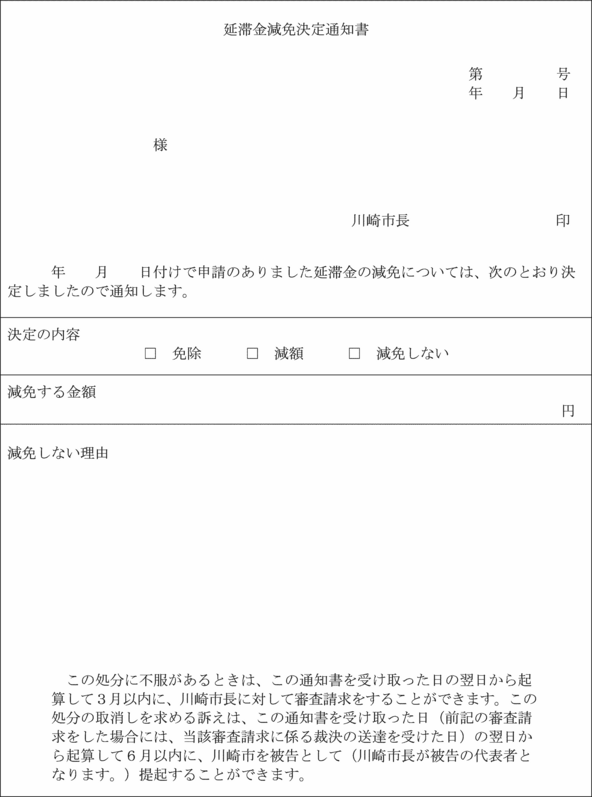 5 市長は、第3項の申請書の提出を受けたときは、必要な調査を行い、その可否を決定し、延滞金減免決定通知書(第6号様式)により申請者に通知するものとする。