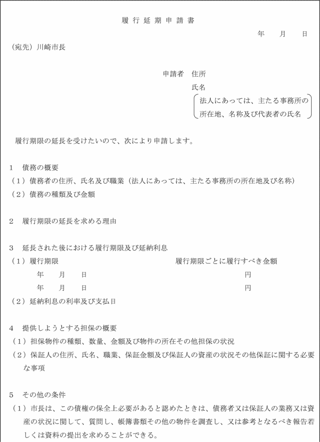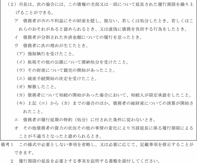 第11条 政令第171条の6第1項の規定による履行期限を延長する特約又は処分(以下「履行延期の特約等」という。)は、債務者からの申請に基づいて行うものとする。